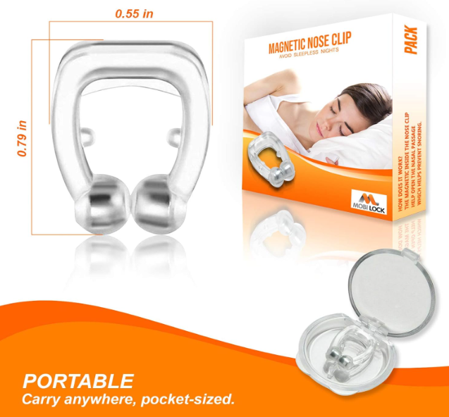 El Mobi Lock Clip Nasal Magnético es la forma más práctica, higiénica y cómoda de reducir los ronquidos nasales de manera natural. Fabricado con silicona médica de alta calidad, este clip se ajusta suavemente a tus fosas nasales y utiliza imanes especiales que ayudan a abrir las vías respiratorias para mejorar el flujo de aire durante el sueño.